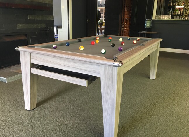 Priced at just $5750 including a two piece dining top as well as a set of accessories valued at $350 including Aramith pool balls, cues, rest stick/jigger, triangle, brush, tips and chalk. Everything you need to get started.