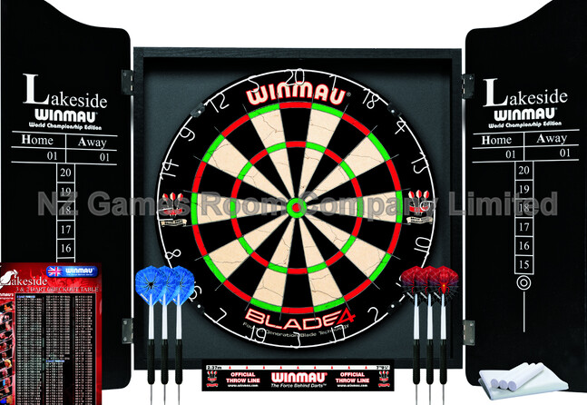 The Winmau Blade 4 is the "go to" board for most international players and this set at just $225 makes it affordable for the "at home" player too. You get the cabinet, fixings, Winmau Blade 4 board, 2 set of darts, checkout poster, oche line, chalk and duster. It is easily installed in about 30 minutes. Grab Yours Now at this low price.