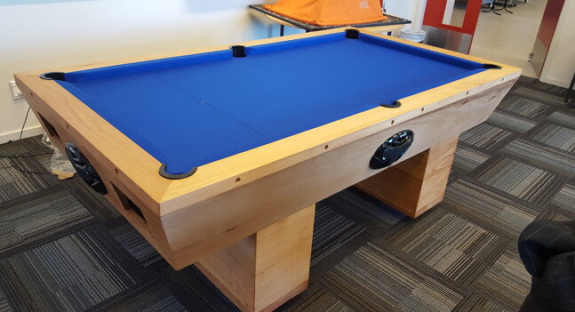 Cameron has used Macrocarpa for the table body and has fitted a media centre (AM, FM, CD and USB), 4 speakers, an amp and strip lighting under the table.