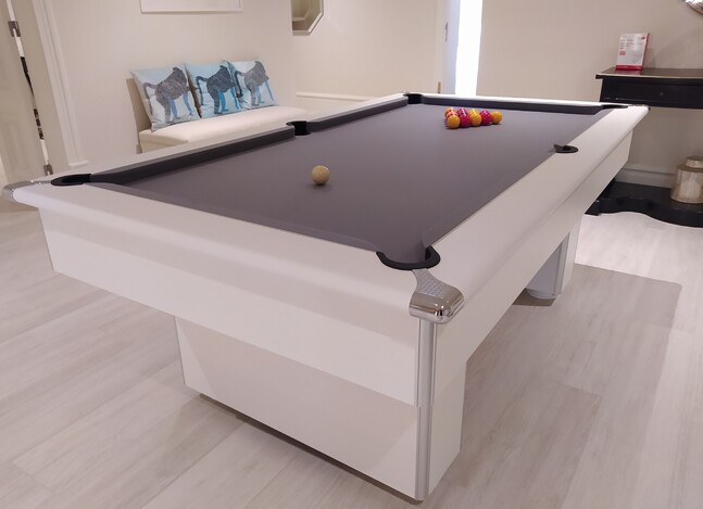 The Richmond Pool Table is one of the best selling slate bed pool tables in New Zealand. It comes in 4 different body colours and 8 different cloth colours too - white body and grey cloth shown.