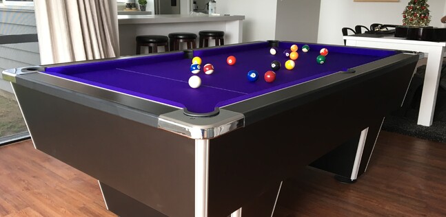 This is the City Pool Table in Black and Purple. It's a 7ft slate bed pool table with Strachan 6811 cloth. The price is just $2750 which includes a full set of accessories. We can deliver and install in Auckland for just $295 or ship to both islands for easy customer self installation - we need your address to confirm pricing. Keen to know more ? Call us on 09 444 6838 and we can tell you which cloth colours and table finishes are available. We close for our holidays on 20th December so if you are keen, then jump to it. Thanks.